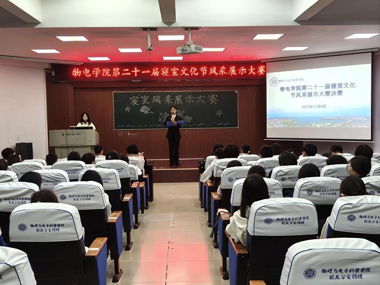 11月6日晚,304永利集团官网入口在六栋学术报告厅开展第二十一届寝室文化节风采展示大赛决赛。院党委书记周畅、2025级辅导员刘莹和辅导员助理莫胜美等担任评委,李汻平主持,2025级全体学生参加。