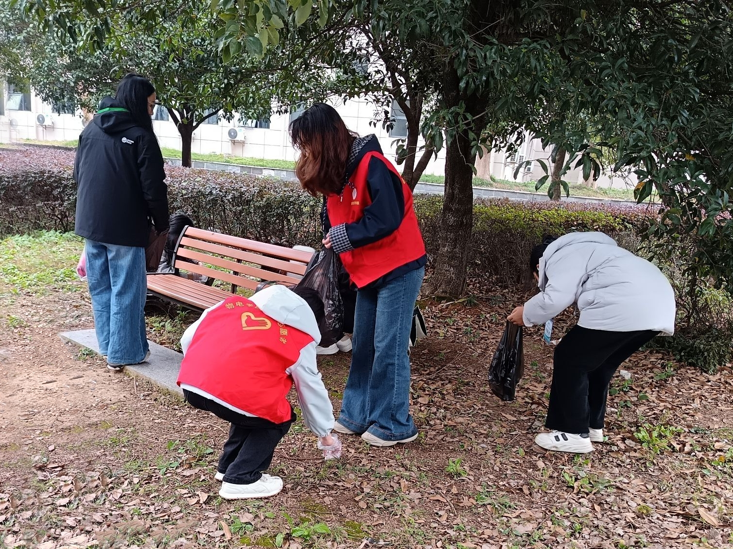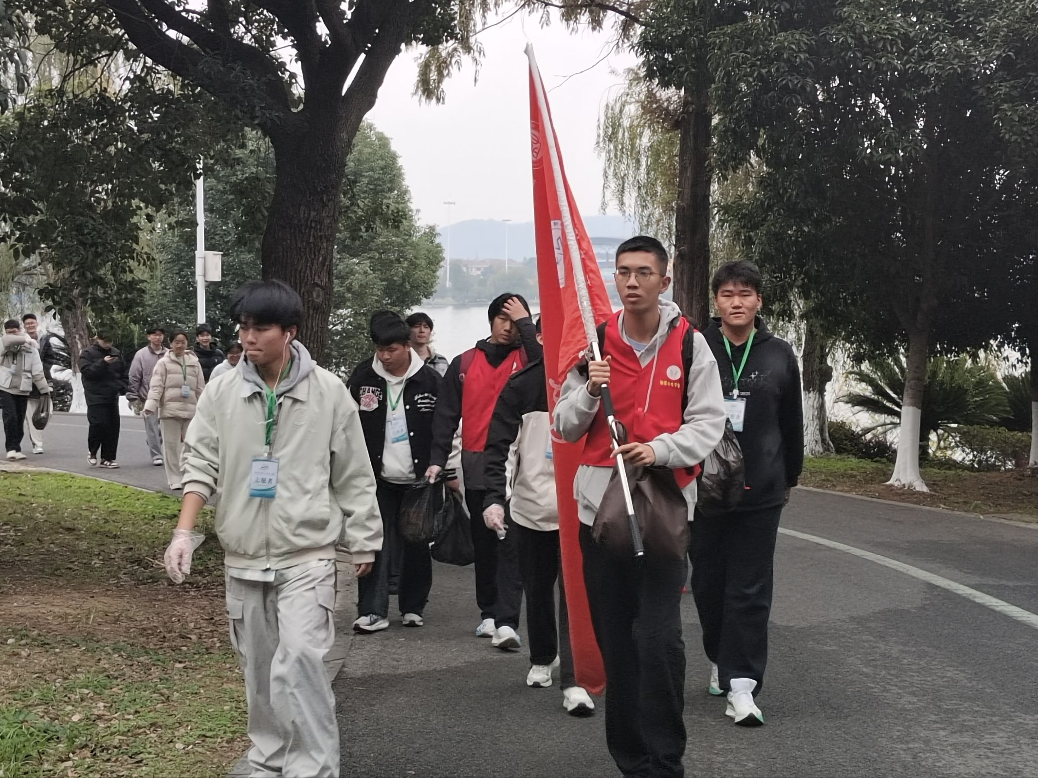 志愿者们从学院集合出发,沿着南湖绿道捡拾纸屑、塑料瓶,红马甲与红旗帜相辉映,成了秋雾里最鲜活的色彩,他们的足迹亦是青春在奉献和服务中成长的痕迹。